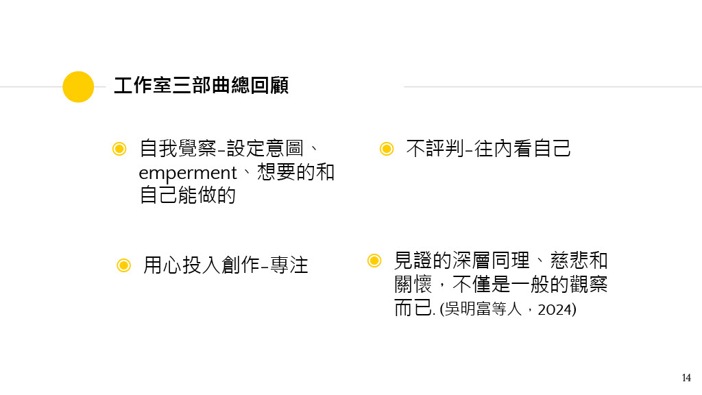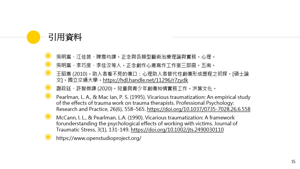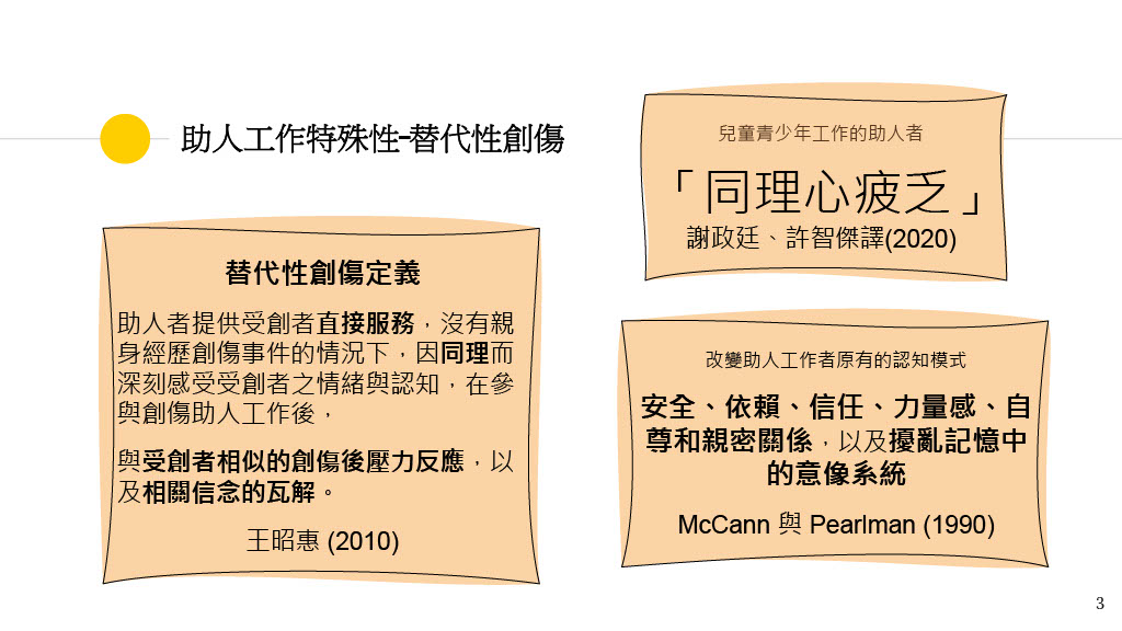關於替代性創傷和工作室三部曲的簡單整理,工作室三部曲是自己在助人工作上探索自己的工作,在服務個案有瓶頸時,在結案前想和個案道別時,工作室三部曲幫助我穩定自己的內在,好好的和案家在內心說再見。